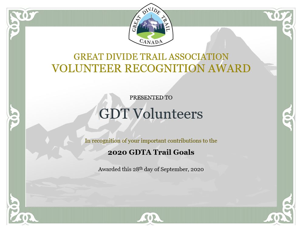 Dave Higgins – In recognition of his leadership and important contributions to the 2020 GDTA Trail Building, Maintenance and Bridge Building Trips. Dave led multiple trail building, trail maintenance and bridge building trips this year. In fact, Dave built not one but two much needed temporary bridges over Cairnes Creek. Dave has been the main person responsible for the rebuild of the David Thompson Heritage Trail and is leading the charge to get a permanent bridge built over Cairnes Creek.