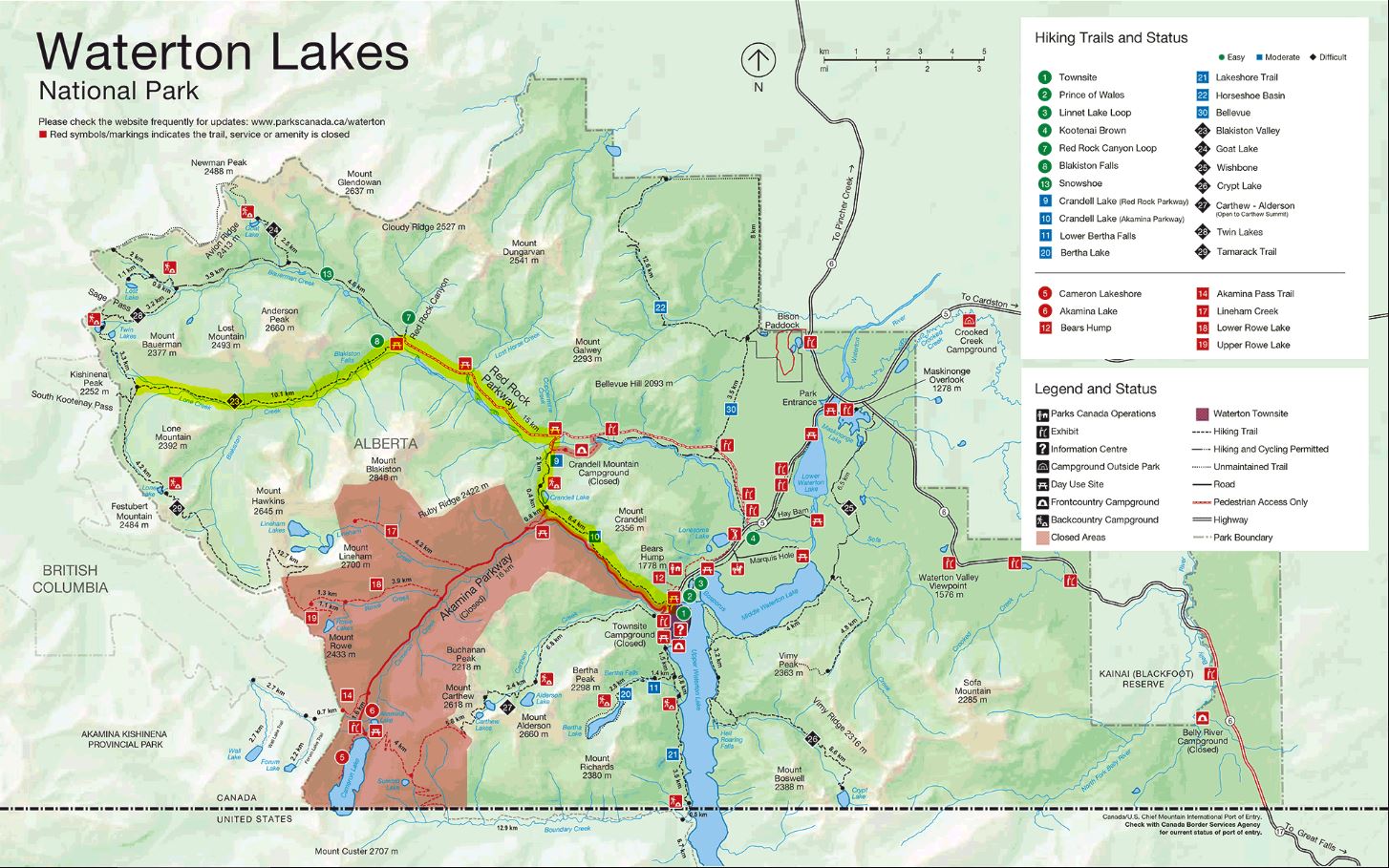 - Waterton Lakes National Park: The Akamina Parkway is closed to vehicles, pedestrians and bicycles due to construction resulting in no access to Cameron Lake, Akamina Pass, Rowe Lakes or the Mount Rowe Alternate Route. As long as the Akamina Parkway remains closed to hikers, a detour can be followed from Waterton Townsite to reconnect with the GDT via the Crandell Lake Trail, Red Rock Parkway and Blakiston Valley Trail, a distance of about 26 km vs 43 km on the GDT.