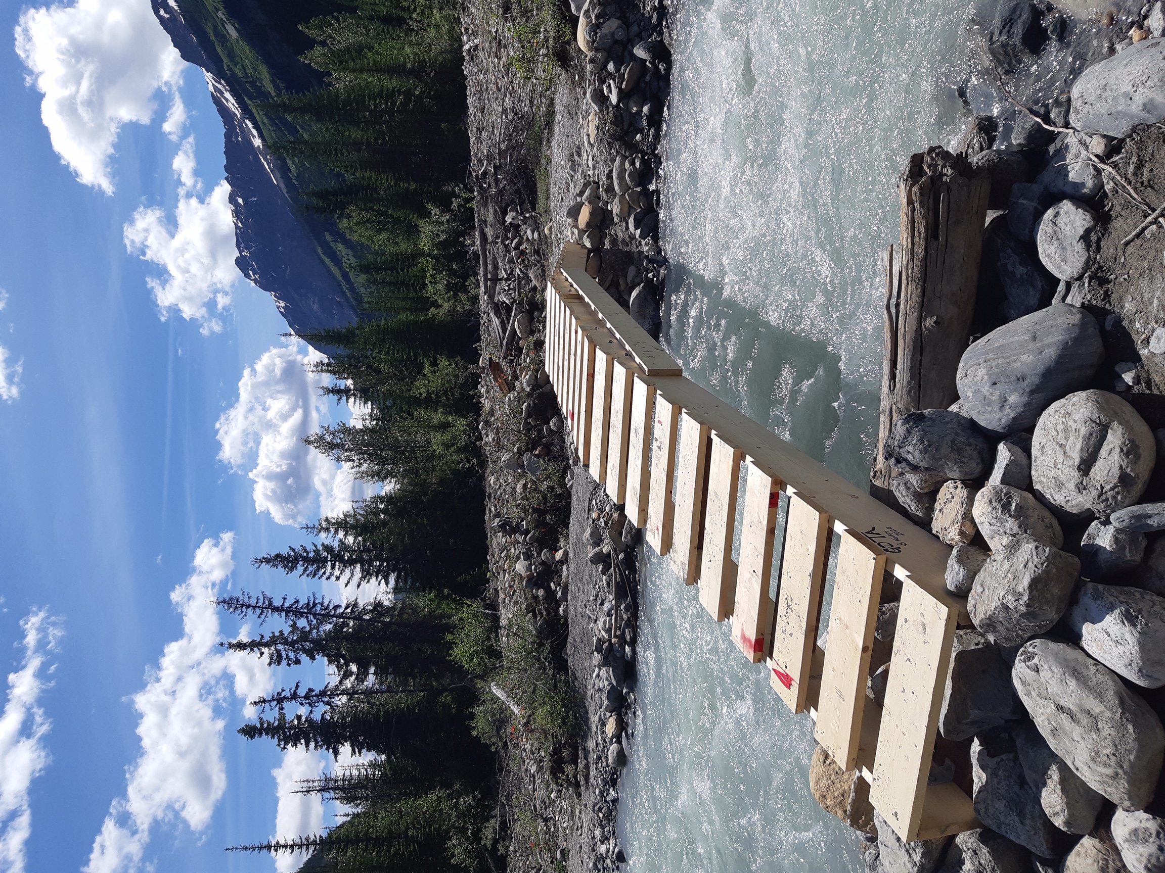 - The Yates Torrent Bridge is out at the crossing of the Coleman Glacier outflow (near f16). Do not attempt to cross at the old bridge location. There are two options: (1) ford the Smoky River in the floodplain; or (2) ford Yates Torrent approximately 500m upstream (location was flagged in 2017). At both locations attempt to cross early in the morning when glacial melt is the lowest or be prepared for a fast and potentially dangerous creek ford.