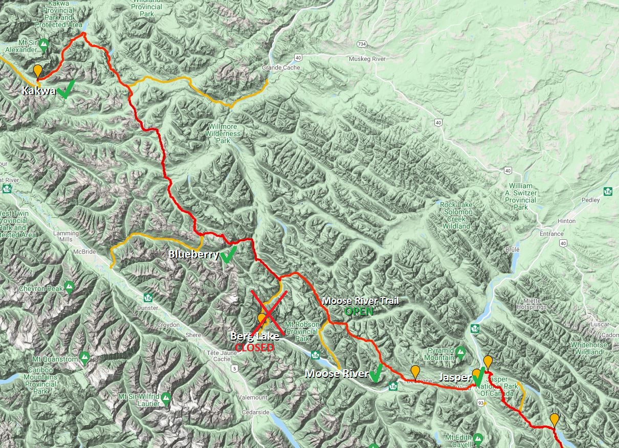 - CLOSURE – Mount Robson Provincial Park: The Berg Lake Trail will remain closed for repairs during the 2023 season, except for the first 7 kilometres from the parking lot to Kinney Lake. Mount Robson Visitor Centre has temporarily suspended its resupply package service. The Moose River Trail is open, giving GDT Hikers 4 options to use as the GDT northern terminus other than the Berg Lake Trail:
