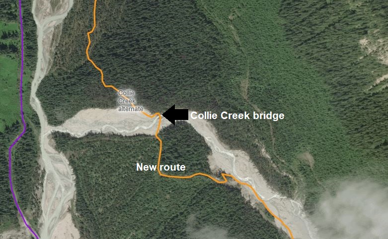 Improvements to the Collie Creek alternate route have taken place this summer, including the construction of a bridge over Collie Creek, making it highly recommended this year. Note the new (flagged) route to access the bridge.