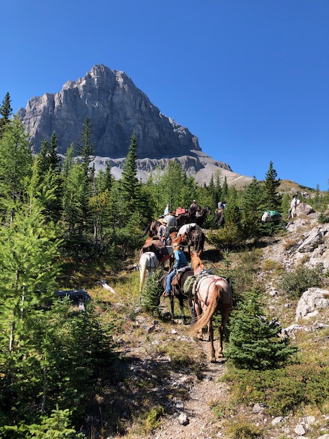 Starting out with ten riders and their horses, eight packhorses, and one mule, we had a successful weekend horse packing up Soda Creek to the Beehive Mountain, and riding along the Great Divide Trail. Not sure when the last horse pack trip would have been up into that area with that number of outdoor horsemen/women, if ever! What a sight 🙂 No trip could be ridden along the GDT without riding into Little Bear Lake, and enjoying the peaceful and beautiful view of our surroundings.