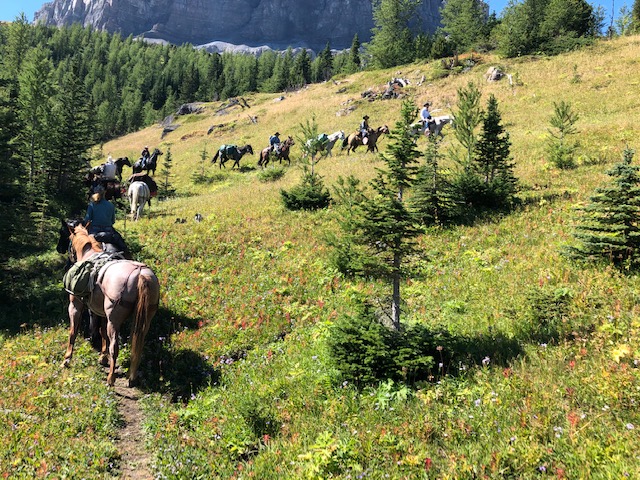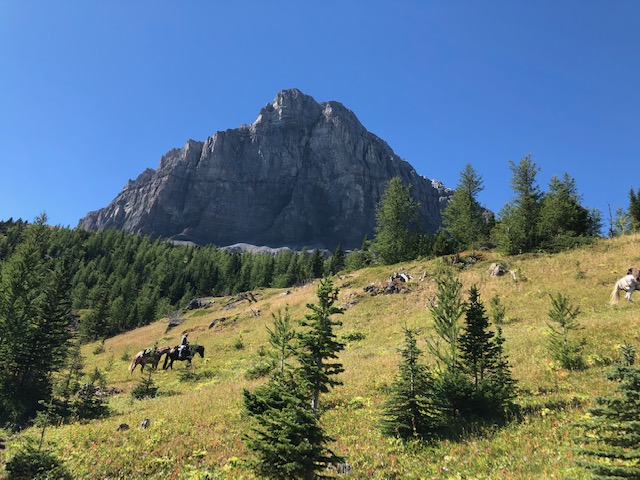 The next day seven riders headed up the trail onto the Mount Gass old road and the GDT hiking trail to head for the old outfitters camp about 5 km away. Since three people had to leave camp for home, as they had work or other commitments, they left shortly after us, following the main road down to the valley and the vehicles, about a 2.5 hour ride. Unfortunately on the way to the old outfitters camp, one of the main horses became ill. So Mac swapped out riding horses with Wyatt, and then Mac walked the sick horse back to our base camp. It was thought that it could have eaten some of the plentiful Death Camas in the meadow. One section of the trail back to base camp was a bit ugly with a steep down trail, and therefore making for a steep up hill on the way back to join the group headed to the outfitters camp! All went well both ways.