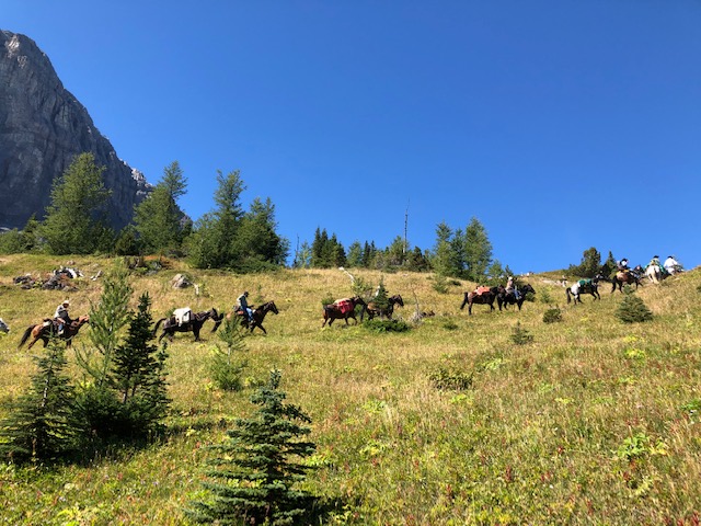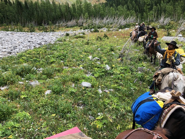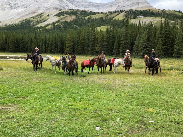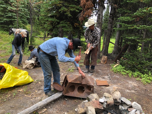 Wendy Ryan is both an avid horseback trail rider and a GDT enthusiast. From Pincher Creek, Wendy has enjoyed time on the GDT over the years, joined the GDTA, and believes in the GDTA’s commitment to preserving, promoting, and maintaining the GDT. She is also interested in horse travel on the GDT. Towards this, last year she and a friend spent time riding their horses in the Beehive area. Among the beauty, they also came across a rather junked-up old outfitters camp at the High Rock GDT campground, a popular camp with hikers despite the heaps of old junk. Wendy wanted to gather up some fellow horse packer friends and clean this mess up. And this summer they did it! Here’s their story…