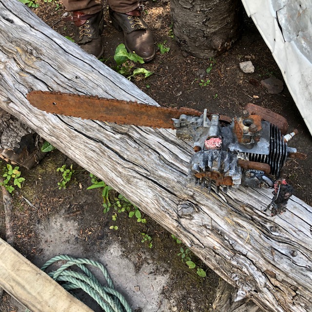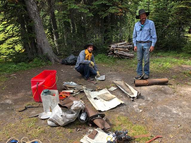 Day 2 – Old rusty chain saw, one of the many pieces of junk removedDay 2 – Assessing the situation amid the junk at the old outfitters campDay 2 – Dismantling and cleaning out the old junkDay 2 – Junk all packed up and ready for loading onto the packhorses, 275 lbs of it!Day 2 – All packed up, the junk is on its way out