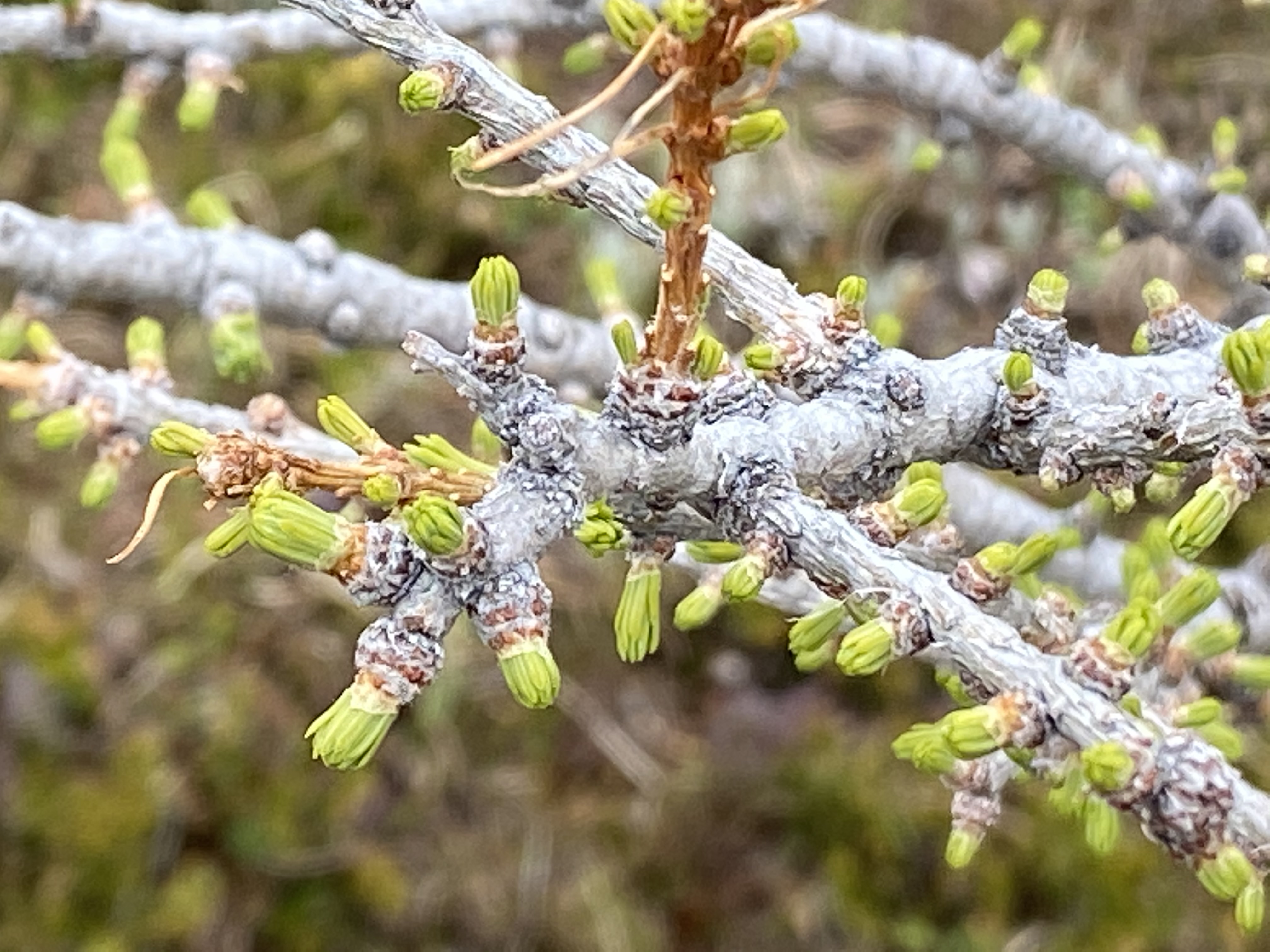 In the spring, nitrogen and the other parts of chlorophyll are brought out of winter storage and reassembled in new soft wispy needles that appear a light bright green. These deciduous needles have no need for waxy cuticles to protect them in winter, or for that matter, big doses of phenolic compounds to ward off winter herbivores, so they don’t require as much carbon as evergreen needles.Larch needles appear delicate but their design is effective in another way. Small and sparsely arranged along the branch stems, a high percentage of these needles get well illuminated since they shade one another to a lesser degree than do needles on evergreen conifers or even the broadleaves on many deciduous trees. This even distribution of light ensures full engagement in photosynthesis, the chemical process enabling green plants to make their own food. Larch needles are thus especially efficient and effective in making food to fuel the larch tree’s growth.