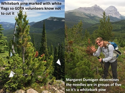 GDTA trail work volunteers must check to see if a pine has needles in groups of two or five. If the latter it is an endangered whitebark pine and must be left alone.