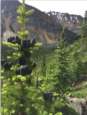 Most cones hang down but subalpine fir cones point up. Tonquin Valley, Jasper National Park, Alta. July