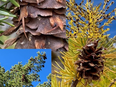 All conifers produce cones but not all evergreens produce cones. Evergreen trees that are not conifers (broad-leaved flower-producing evergreens) flourish in the tropics. Deciduous conifers exist as well and can even be seen along the GDT. The “larch madness” that afflicts hikers in the Rockies each autumn derives from people’s fascination with the needles of the coniferous subalpine larch turning gold before the tree sheds them. You can read more about this fascinating tree in The Lovely Larch – Coolest Tree on the GDT from the October 30, 2020 issue of The GDTA’s Pathfinder Newsletter.