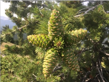 The unique cones of the whitebark pine grow at right angles to the branch.