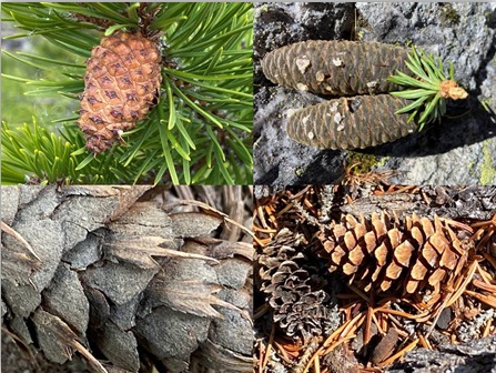 Douglas-fir cones (left) and subalpine larch cones (right) both have mouse-tail shaped bracts but larch cones are much smaller