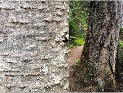 The bark of the conifer trees along the GDT tends to be less helpful in identifying species except in a few cases. Subalpine fir has characteristic silver grey bark with distinct resin blisters. Older Douglas-fir trees have thick insulating bark, an adaptation to help the tree resist light intensity forest fires. Mature sub-alpine larch trees also possess thick fire-resistant bark.
