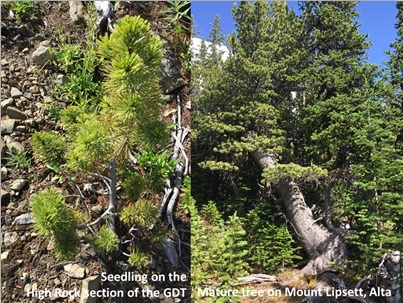 Sometimes people make the assumption that every cone is a pine cone and thus all the trees they see are pines. Along many parts of the GDT where forest fires prevailed in the past, lodgepole pine still dominates many forests. However, if you look closely, you will see other trees growing in the shade of those pines, including white spruce. In certain drier areas you may also see Douglas-fir rising above the pines. Don’t be fooled; the Douglas-fir is not a true fir. It is a unique type of conifer in its own genus[1]. Along the GDT, you have to ascend to higher elevations (600 to 2,250 metres asl[2]) to see a true fir, the subalpine fir. In snow-dominated forests below the treeline, the spruce you see is the Engelmann spruce. On the high rocky windswept ridges, lodgepole pine gives way to whitebark pine, Canada’s only endangered tree species protected by federal species-at-risk legislation. In western Canada, whitebark pine occurs in a diversity of forested ecosystems, predominantly in the upper montane and subalpine from the Canada-US border to its northern extremity near the continental divide at Kakwa Wildland Interprovincial Park. Usually found around 2400 metres above sea level (asl) in the vicinity of the GDT, the low-elevation extent of the species’ range is around 1700 metres asl.
