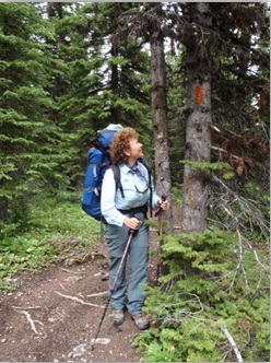 The author gazing at a GDT blaze on the trunk of a subalpine fir tree, Oldman headwaters, August 2010).