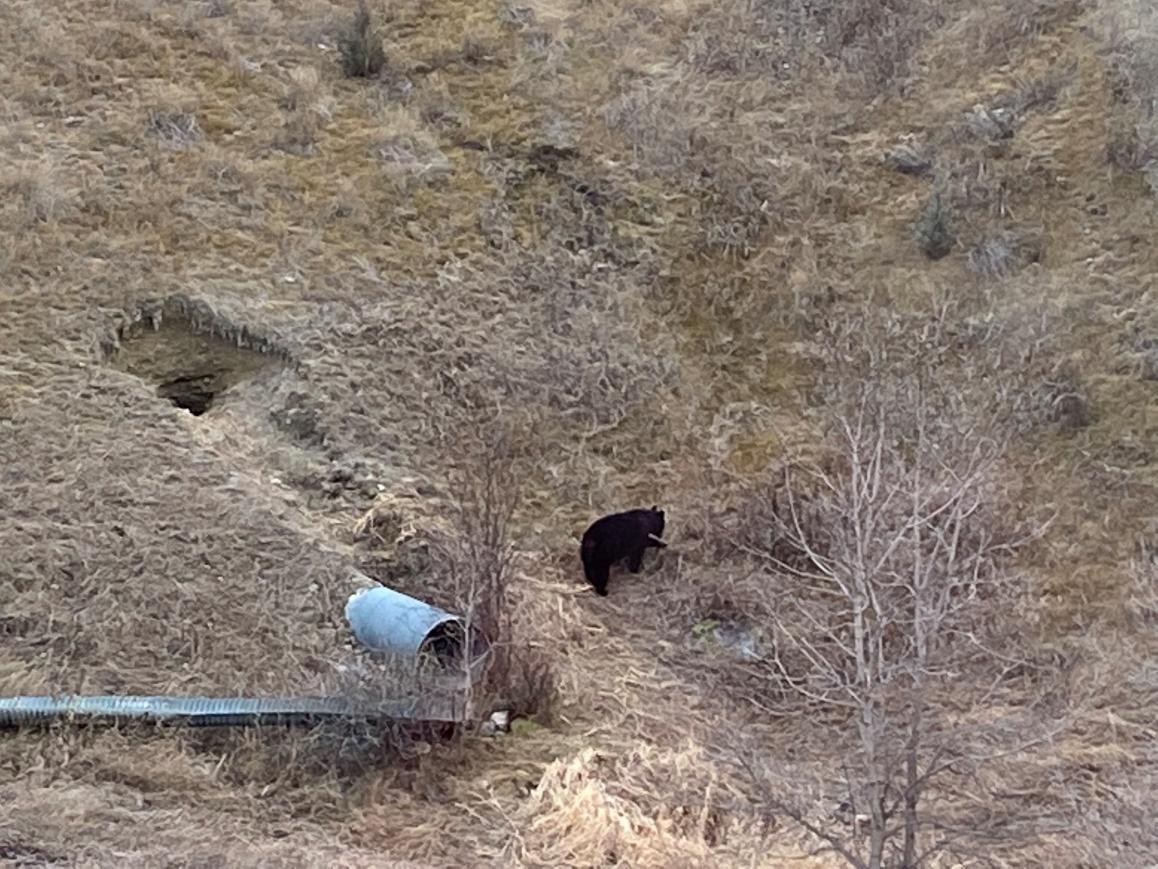 Black bear gathering and piling up dried grass to bring into its den (the hole above the culvert) in a ravine near Invermere, B.C., Dec. 3, 2021