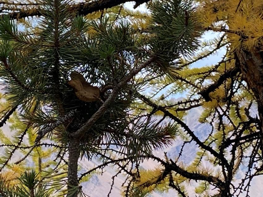 An American red squirrel stashed this mushroom in a young lodgepole pine protected by a large old subalpine larch