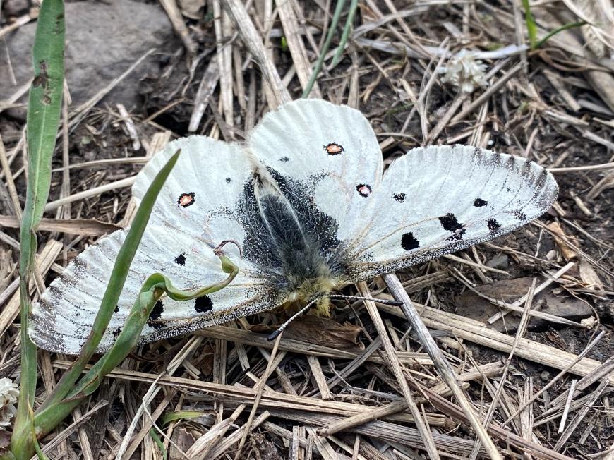 Although the adults of the Rocky Mountain Parnassian die each fall as temperatures plummet, their eggs survive and their caterpillars hatch next spring to feed on lanceleaf stonecrop.