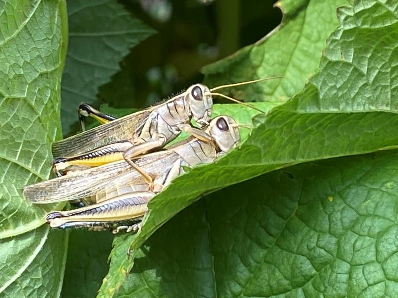 Two two-striped grasshoppers (Melanoplus bivittatus) preparing for winter in Waterton Lakes National Park, Alberta.