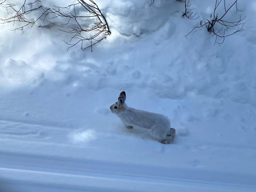 Snowshoe hare beside cross-country ski trail in Peter Lougheed Provincial Park in March 2020.