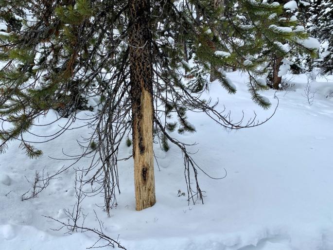 In winter, porcupines eat the nutritious inner bark of pines, like this lodgepole pine near Lake Louise, Alberta, Feb. 2023.