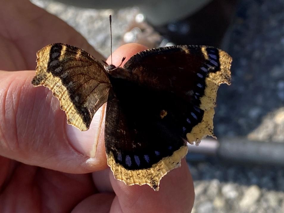 A Mourning Cloak is a large, long-lived butterfly that stays in the Rockies all year long.
