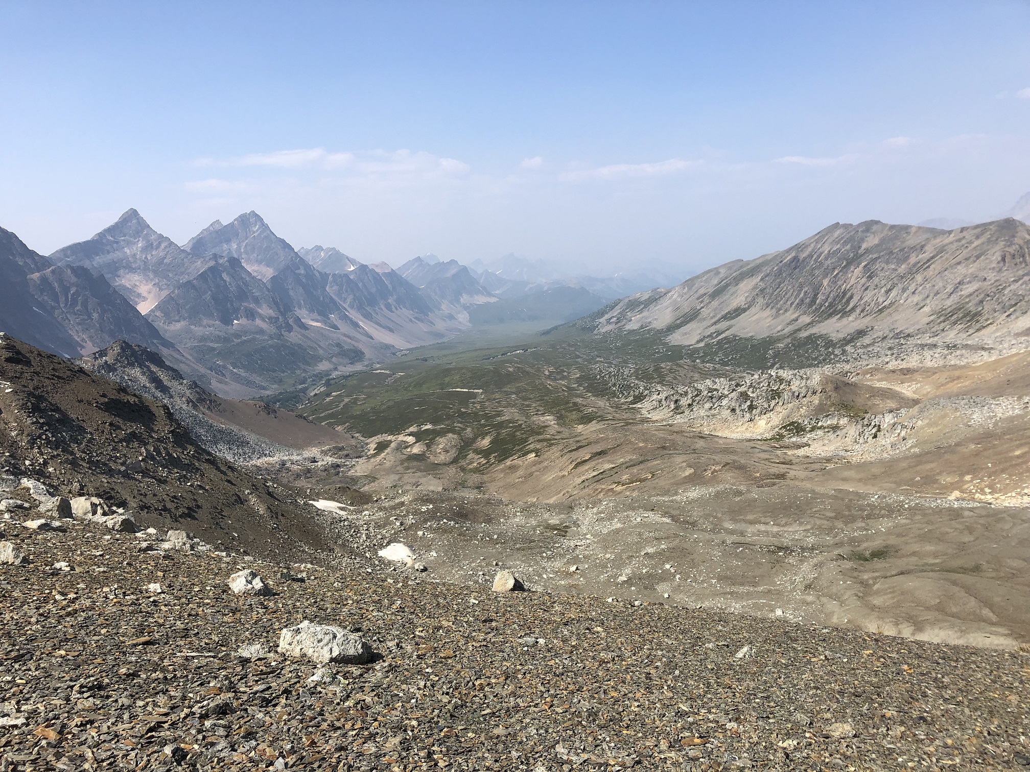 From Kiwetinok Pass only 7 km remain until rejoining the GDT in the Amiskwi Valley. However, the remainder of the route is off trail involving challenging route-finding with significant elevation loss and gain, and thus substantially more rugged than the good trail you have enjoyed up to the pass. Allow several hours.