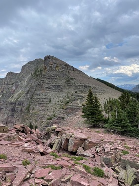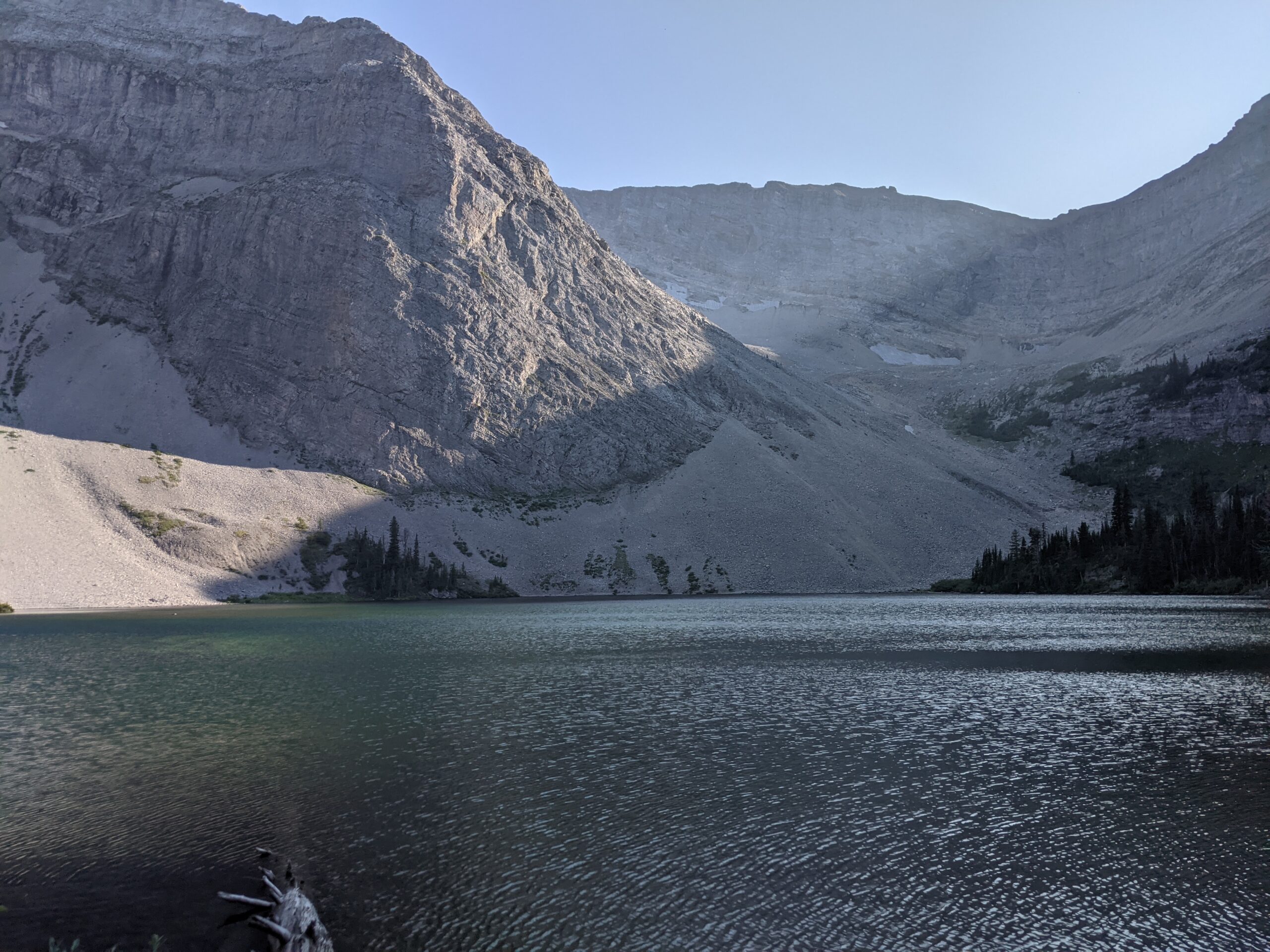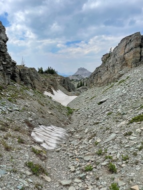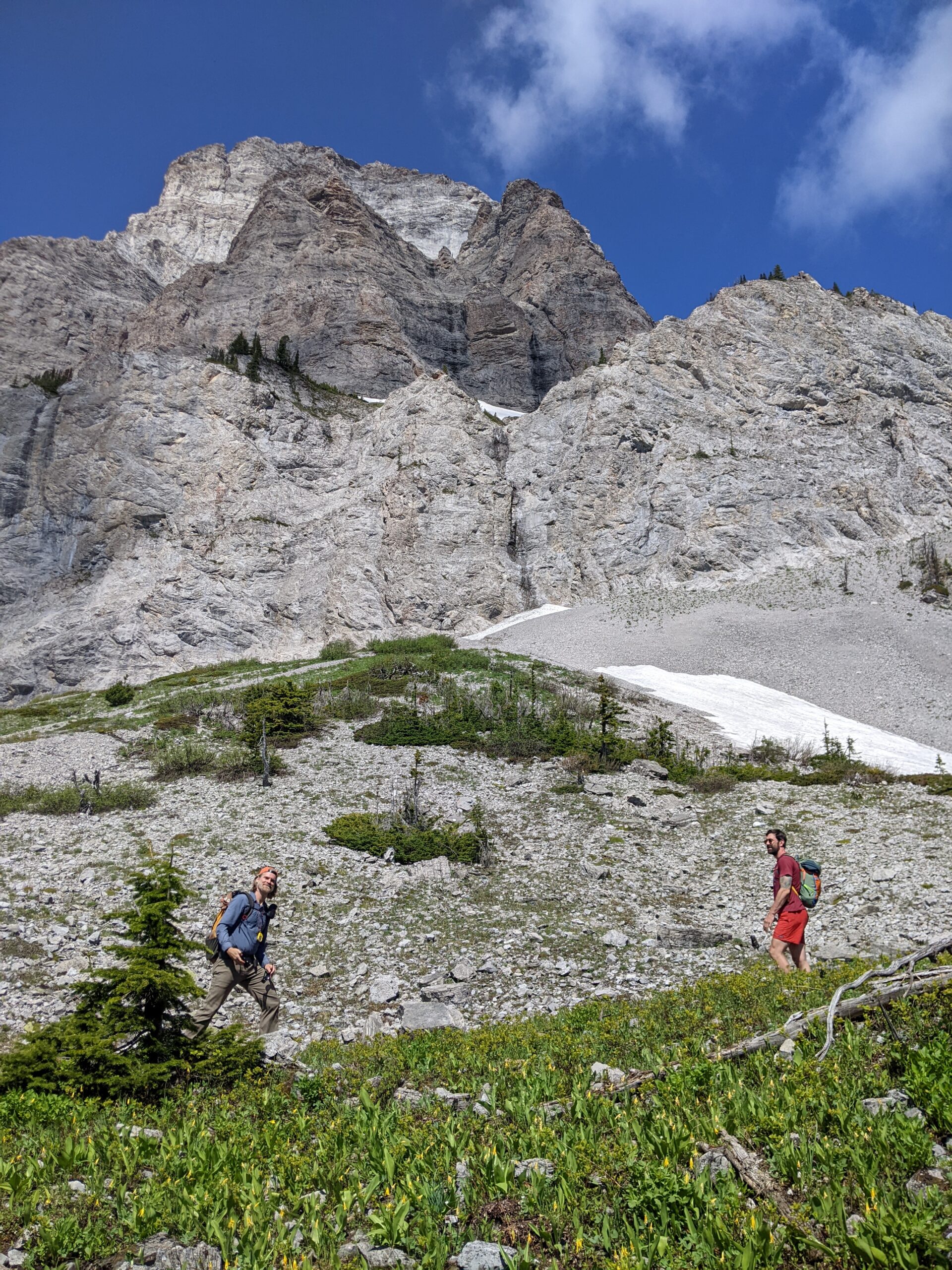 We looked at it for a while. The terrain this close to the sheer cliff face was mostly open: easy to navigate through with no bushwhacking. But new trees grew close to the scree slopes at the base of the wall. It looked like an avalanche had taken out their predecessors. I thought about some of the worst sections on the GDT: climbing through a pile of trees snapped like matchsticks at the approach to Tornado Saddle, or being delayed by 45 minutes north of Mount Robson by a wall of avalanche debris as tall as a house.