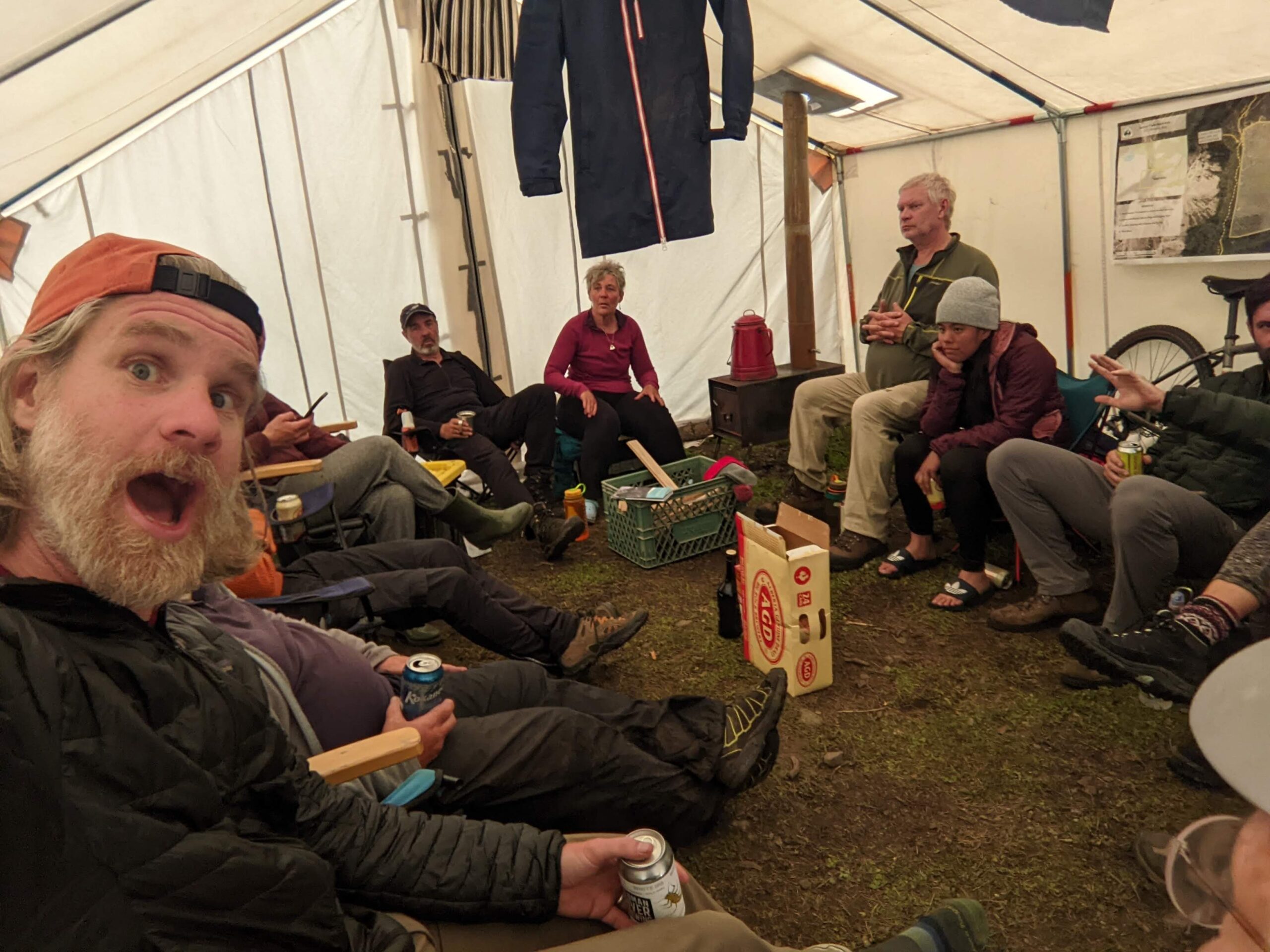 So at the end of June, we pulled into a clearing a few kilometers away from the High Rock Trail a day before the trip was supposed to start. Steve, Joe (our friend from our 2021 thru-hike) and I were greeted by canvas wall tents, a smoking firepit and GDT legend Doug. We wandered off to set up our tents, and by the time we returned to the firepit, Emily and Julien had arrived, also a little early.