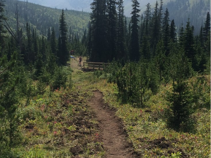 Work on the High Rock Trail between Alison Creek and Window Mountain Lake was completed over 6 backcountry trips, including a new trail completed to take 2 km of the GDT off steep ATV tracks. New signs were installed at key intersections along the route. Deadfall was removed between Window Mountain Lake and South Hidden Creek, and the South Racehorse Creek bridge was repaired. Some trail was rerouted to protect an environmentally sensitive area.