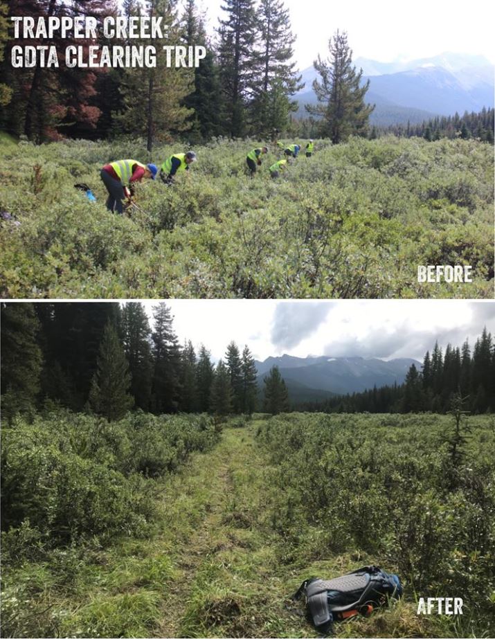 Once again, the GDTA partnered with Friends of Jasper to clear and maintain the trail on Maligne Pass in Section E, clearing encroaching small trees and shrubs along 500m of trail east and west of Mary Schaffer Campground.