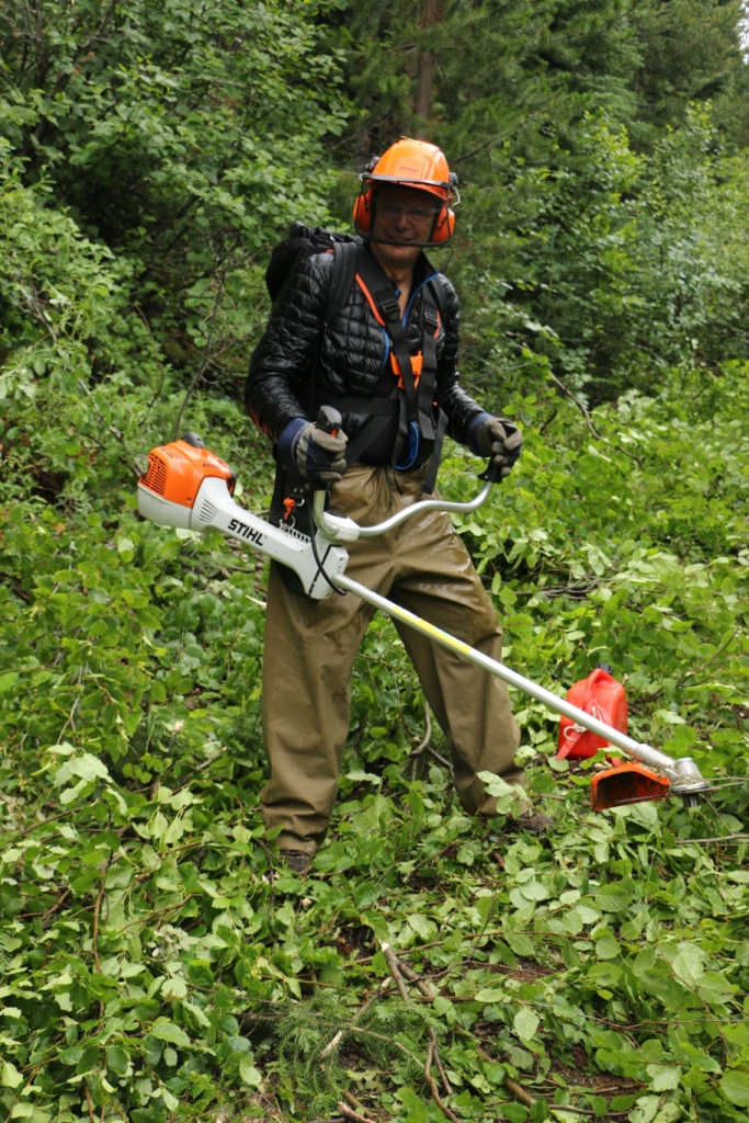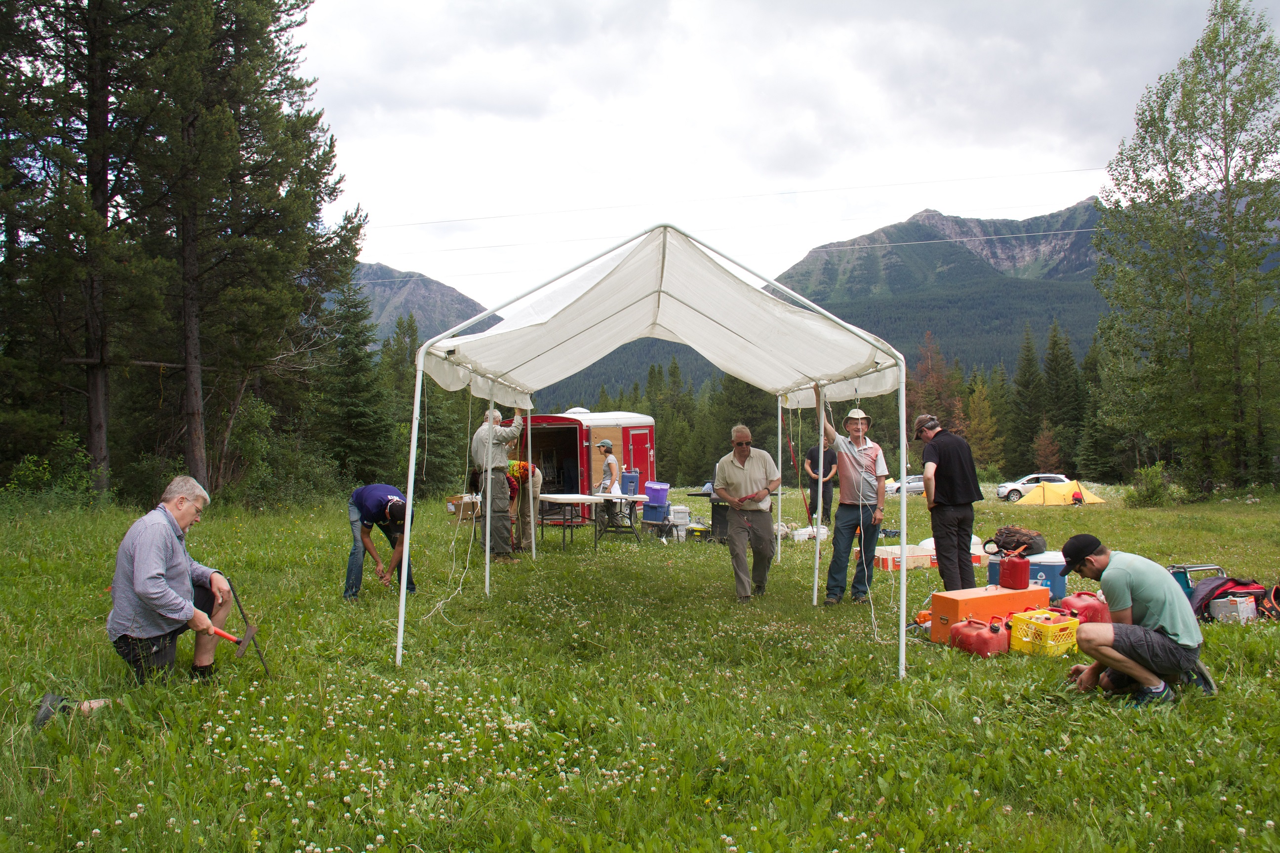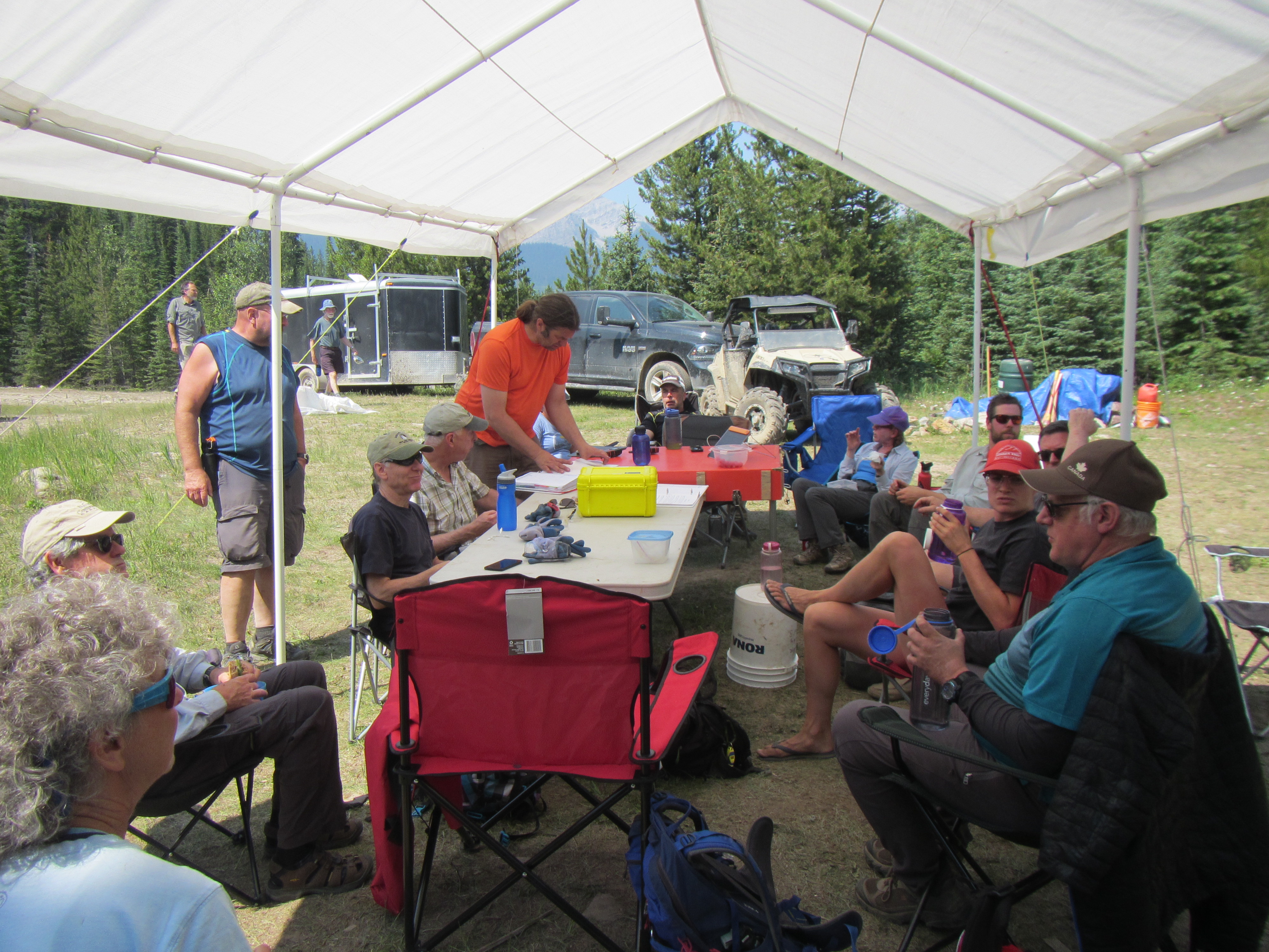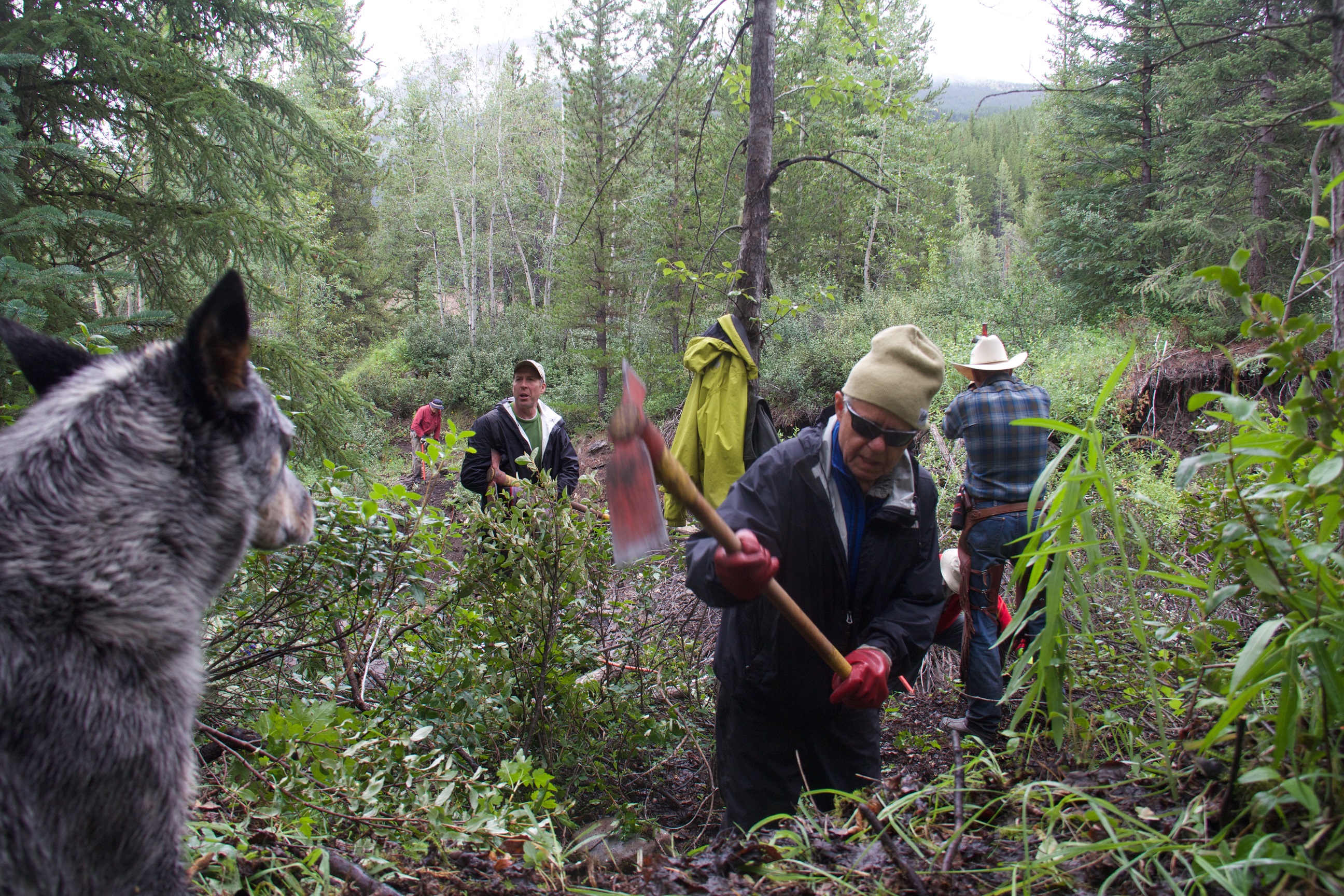 July Trail Building Trips – The first crew arrived at Dutch Creek on July 16, after a long five hour drive from Calgary, the last hour and a half over a slow going rough and bumpy road. After setting up personal tents, the crew spent the next four hours unpacking and setting up a comfortable camp and sorting through the multiple tools needed for the three different crews over the next 12 days. This year’s camp included two large shelters with the one for the kitchen being totally enclosed. A sheltered latrine was built and an outdoor shower was set up. The solar heated shower was much appreciated and a very popular luxury that all three crews took advantage of. There was little time left in the day but the crew was anxious to get working. One group walked a 4 km access trail, bringing the tools they would need for the next day’s work and assessed what they would be doing. A separate chainsaw crew brought their power equipment and were given instructions on the blazing and type and size of corridor that needed to be cut and brushed.