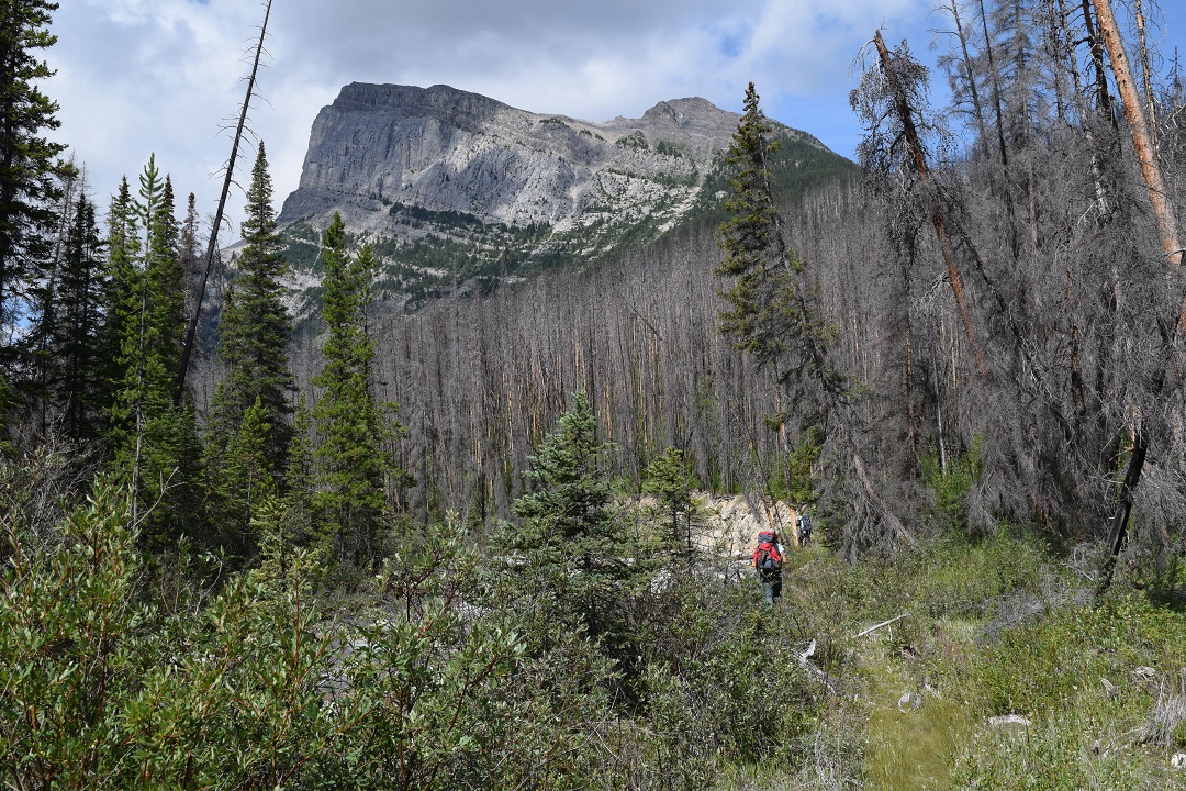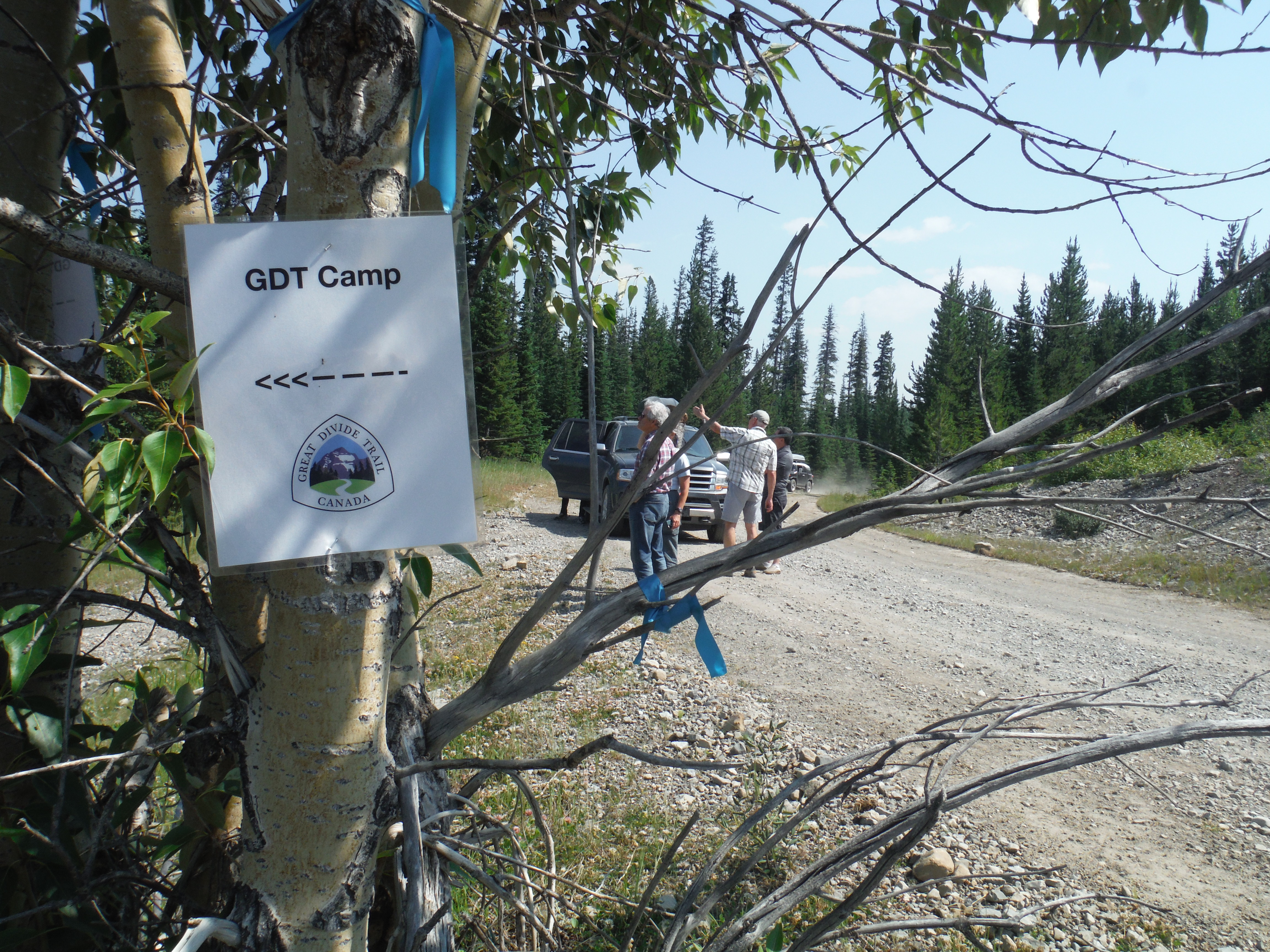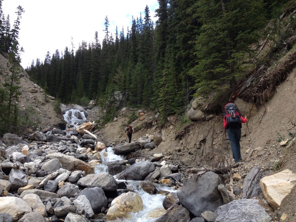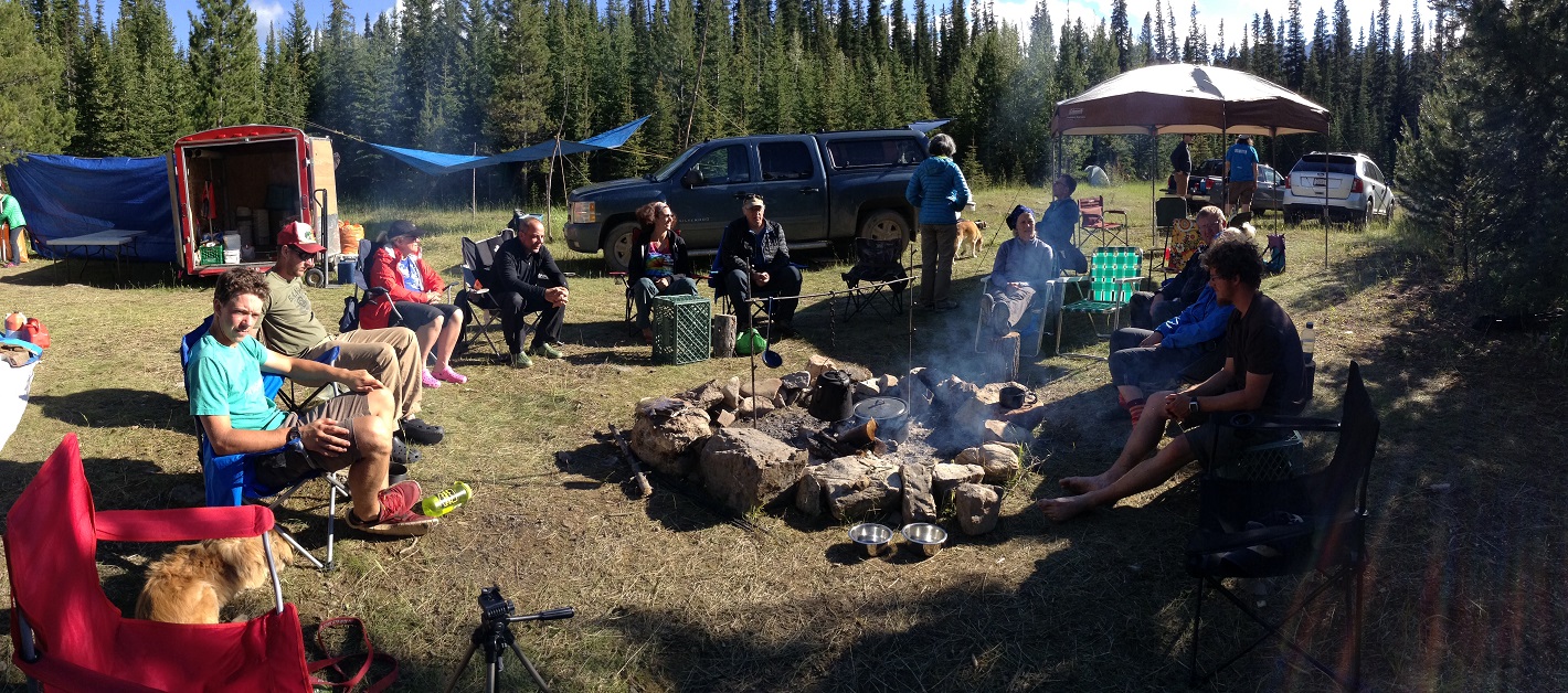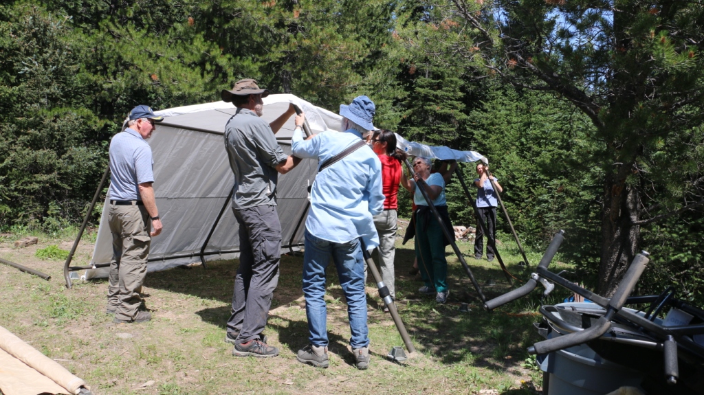 July Trail Building Trips – The first crew arrived at Dutch Creek on July 16, after a long five hour drive from Calgary, the last hour and a half over a slow going rough and bumpy road. After setting up personal tents, the crew spent the next four hours unpacking and setting up a comfortable camp and sorting through the multiple tools needed for the three different crews over the next 12 days. This year’s camp included two large shelters with the one for the kitchen being totally enclosed. A sheltered latrine was built and an outdoor shower was set up. The solar heated shower was much appreciated and a very popular luxury that all three crews took advantage of. There was little time left in the day but the crew was anxious to get working. One group walked a 4 km access trail, bringing the tools they would need for the next day’s work and assessed what they would be doing. A separate chainsaw crew brought their power equipment and were given instructions on the blazing and type and size of corridor that needed to be cut and brushed.