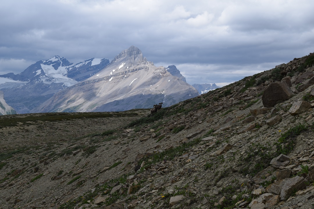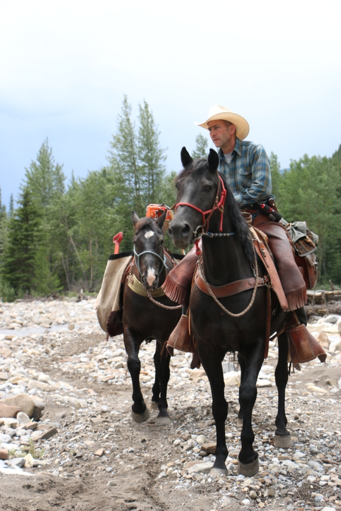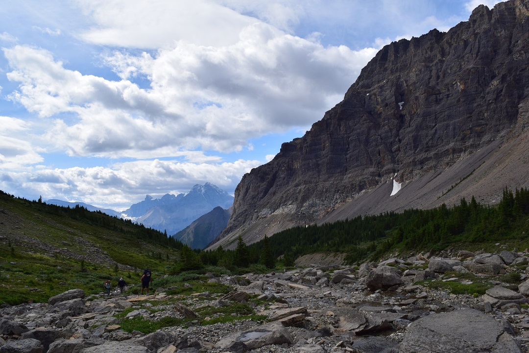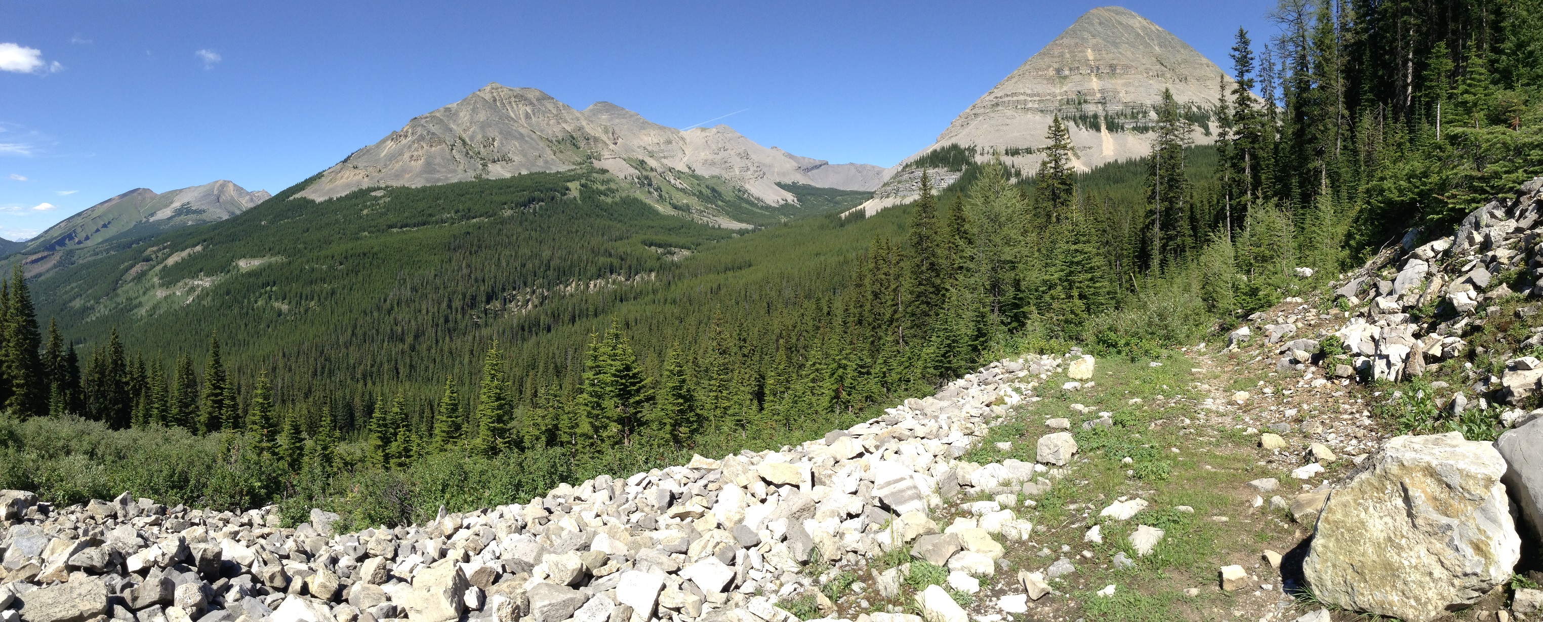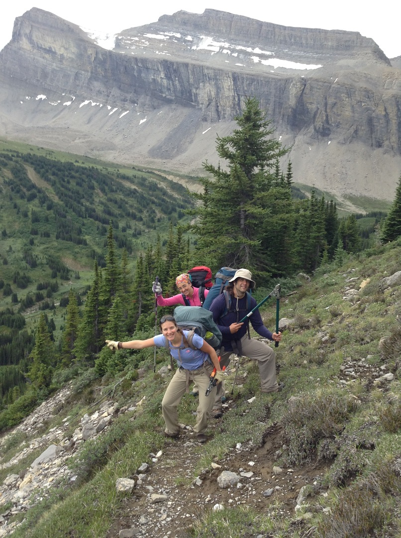 July Trail Building Trips – The first crew arrived at Dutch Creek on July 16, after a long five hour drive from Calgary, the last hour and a half over a slow going rough and bumpy road. After setting up personal tents, the crew spent the next four hours unpacking and setting up a comfortable camp and sorting through the multiple tools needed for the three different crews over the next 12 days. This year’s camp included two large shelters with the one for the kitchen being totally enclosed. A sheltered latrine was built and an outdoor shower was set up. The solar heated shower was much appreciated and a very popular luxury that all three crews took advantage of. There was little time left in the day but the crew was anxious to get working. One group walked a 4 km access trail, bringing the tools they would need for the next day’s work and assessed what they would be doing. A separate chainsaw crew brought their power equipment and were given instructions on the blazing and type and size of corridor that needed to be cut and brushed.