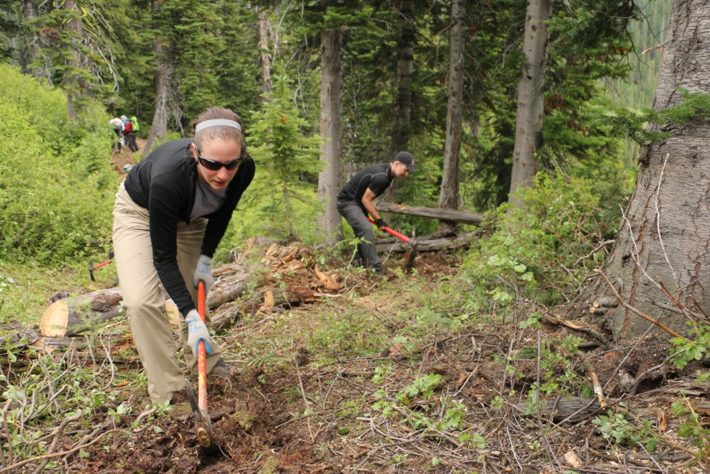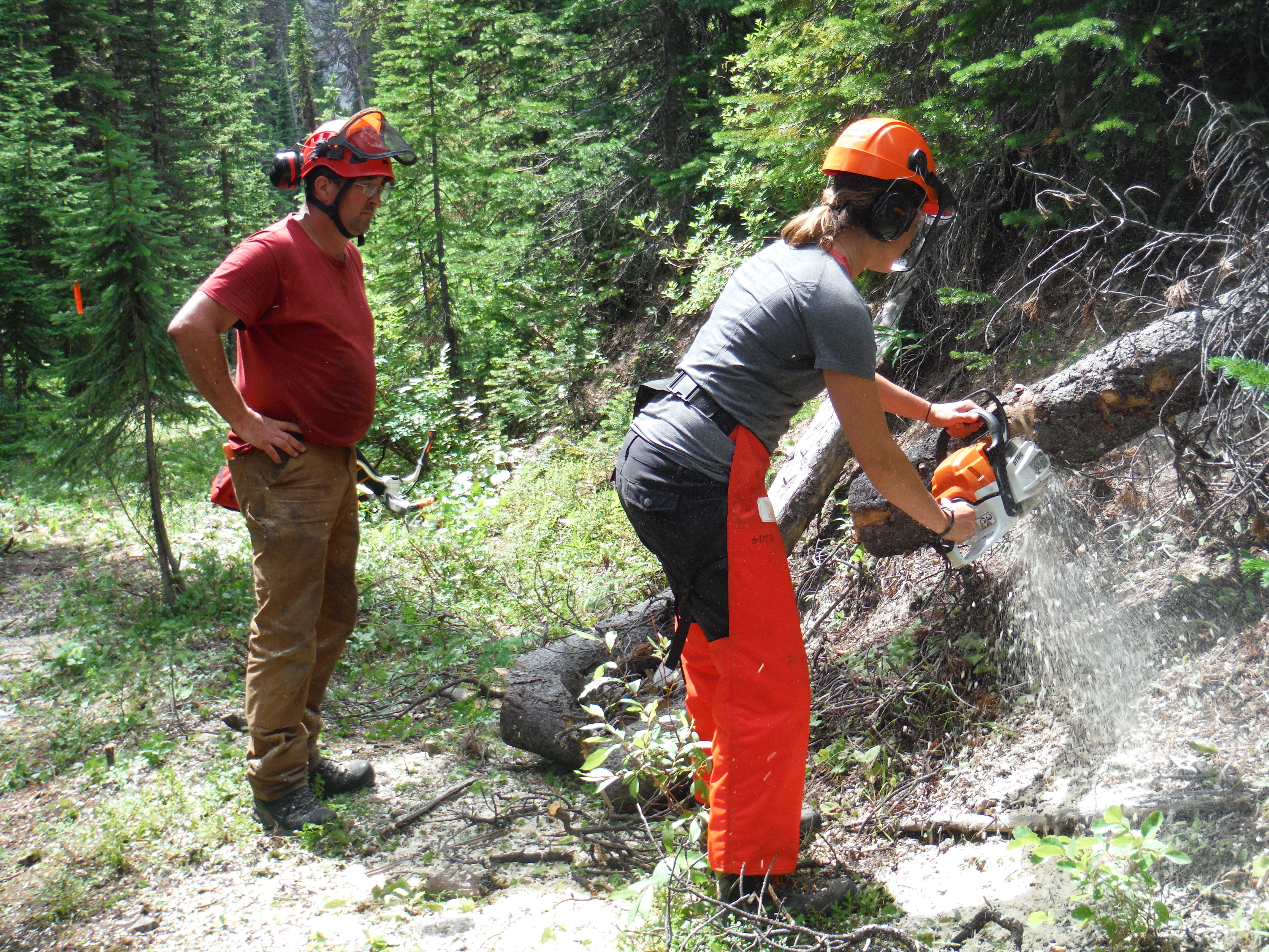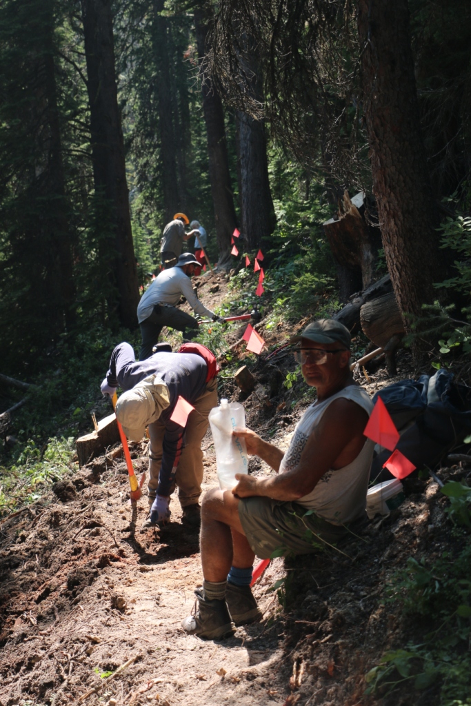 Day 2 saw the group again split in two. Both crews got specialty tool orientation and training after the daily safety tailgaters. One crew spent the morning clearing the trail to the location of a new bridge over a creek affectionately referred to as “Fred”. They then moved up to the new trail built last year to make some improvements. The second crew began the chainsaw and brushing work on a new section of trail. After 100 meters, the tread and finishing crew moved in and started the tread development on some steep side hill. Bodies and muscles were sore at the end of the day but all the team members were feeling a great sense of accomplishment.