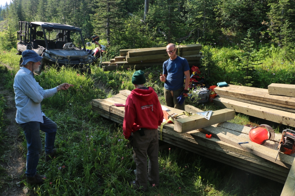 August Bridge Build – The new “Fred” bridge was originally planned to be completed by the July crews. Unfortunately there was an equipment breakdown and helicoptering in the big span logs was delayed until the last work day for the crews. The sill work had been completed, the spans were set and all the boards and attaching hardware left at the site. All that was left to do was build the decking and railing. Two volunteers, Doug and Rick, were sent out over a long weekend to see if they could finish the bridge. Things got complicated a bit as an ATV ban for the area had just been put into place. Getting heavy tools and gear to the bridge site was the issue. Doug and Rick were able to fit everything in a wheelbarrow and backpacks and slowly worked the load up an old quad trail 3 km to the bridge site. Once at the site they proceeded to decipher the engineering plans and put the decking in place.