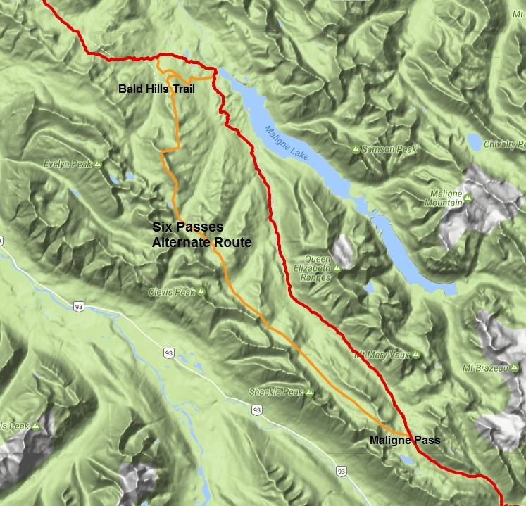 Six Passes Alternate Route (provided by the author of Hiking Canada’s Great Divide Trail guidebook, 3rd edition, Dustin Lynx) – 36.9 km instead of 31.6 km – Hikers only. If necessary, ask the Jasper park office for a 1-night random camping permit on this alternate route.