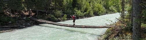 • The log bridge across the Blaeberry River near Cairnes Creek Rec Site (built in June 2024) was still in good shape at the end of the 2025 hiking season, connecting the Collie Creek alternate with the David Thompson Heritage Trail. If all goes according to plan, the bridge will be replaced by a new cable car this summer, creating a long-lasting connection to the Collie Creek Trail on the east side of the Blaeberry River.