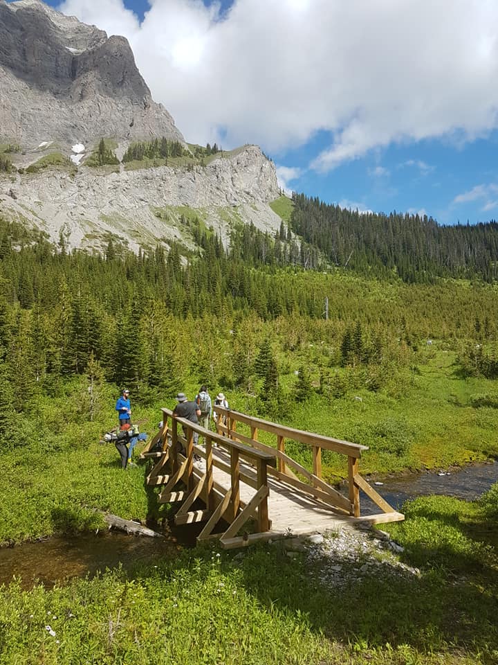 The trail continues for 700 metres across the basin and into the forest before starting a steep climb. Over the next 1.5 km, ascend several switchbacks climbing to the saddle between Hail Ridge and the main divide at 2165m. Descend more gently on the north side of the saddle, 1.3 km down to an old road at 2000m in an old cutblock in the open basin below the huge headwall of the divide. Follow the old road for 800 metres as it curves northward to reach a signed trail junction (b9). First Creek campground is 200 metres off route to the right (northeast). The HRT follows the trail left (northwest), across the First Creek Bridge, for 1.3 km as it ascends along the eastern edge of an old cutblock until the trail enters the forest at 1980m. In another 700 metres of steady climbing, the trail reaches the saddle at 2060m. A rest stop with an excellent viewpoint lies slightly off route, 100 metres west of the saddle.