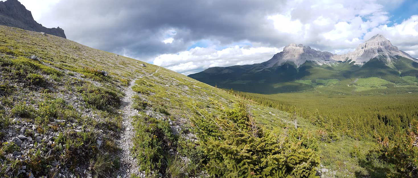 The trail climbs steadily for 600 metres to reach treeline at 1820m. The trail remains above treeline with spectacular views of Crowsnest Mountain to the east, contouring between 1840m and 1920m for the next 3 km. The trail intersects with an ATV track before dipping back into the forest. In 100 metres, you reach another intersection with the same ATV track and again stay on the trail in the forest, continuing north. The trail stays in the forest for 350 metres before reaching treeline again at the beginning of a short steep climb up a talus slope. The trail climbs 100m over 500 metres, staying just above treeline before the gradient eases off at 2000m. Continue for 1 km, contouring above treeline and up a set of switchbacks through sparse trees to a forested ridge crest. Follow the forested ridgeline for 500 metres to a high point at 2100m (b6) with incredible views of the Crowsnest valley, until the trail veers away from the ridge dropping into the forest. In 100 metres, the trail enters an old cutblock where it will mostly remain for the next few kilometres. There is regrowth in the old cutblock but still many outstanding views of the impressive headwall of the Great Divide.