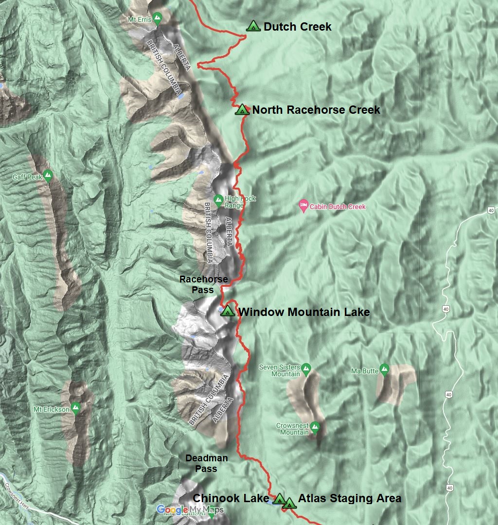 Follow the ATV track for 1 km to a junction. Stay left (north) at the junction and descend slightly to cross Fred Bridge. Continue following an ATV road northeast for 2.4 km to a junction with an old logging road at 1715m (b12). Good camping next to Dutch Creek exists 200 metres down the road to the right. The HRT continues left (northwest) following the old road for 4.2 km, climbing gradually through several old cutblocks until it ends at 1910m. The trail briefly turns northeast before it begins following an old seismic line north. In 900 metres, the trail turns sharply east into the forest before descending 60m over 400 metres to reach the Dutch Creek Bridge (b13). Just beyond the bridge, the HRT reconnects with the original GDT as it descends from North Fork Pass.