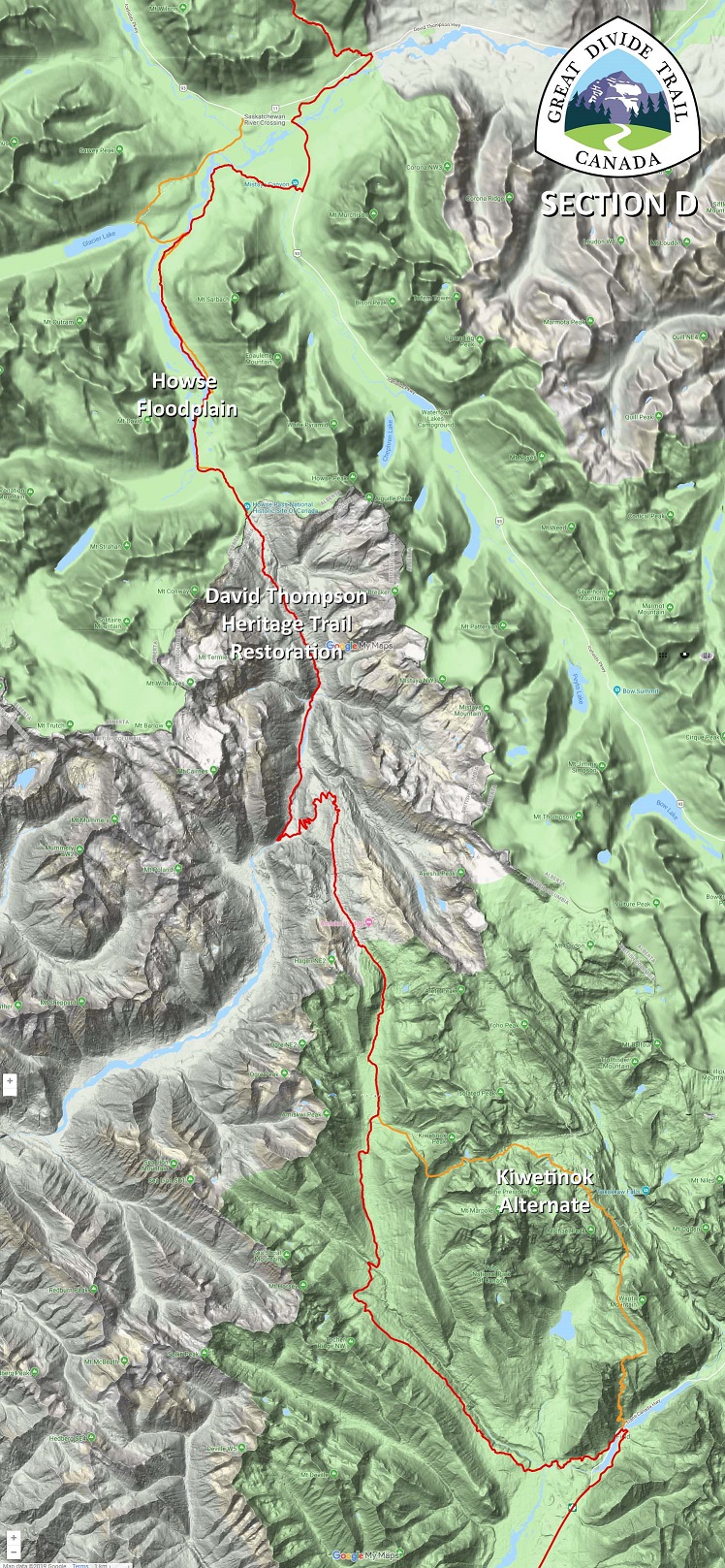 This year, Section D has undergone a “facelift” with the re-routing of the main route onto the Howse Floodplain, the restoration of the David Thompson Heritage Trail and the introduction of the new Kiwetinok Alternate. While Section D will always be a remote and wild section of the GDT, requiring some route-finding, challenging creek fords, and increased physical and mental effort, GDT hikers can now look forward to more rewards for their efforts and a significantly improved hiking experience in 2019.