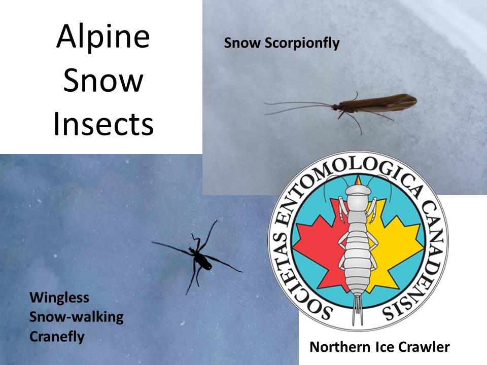 Another critter you could encounter out on the snows of the Great Divide is the northern ice crawler, Grylloblatta campodeiformis. These omnivorous insects are nocturnal predators and scavengers that actively search for small, invertebrate prey. They also venture onto snowfields, foraging for “insect-fallout” carried and deposited there by wind. Each individual adult is about 30 mm long, just over an inch, and a nice honey beige colour. The first specimen known to science was discovered in Banff National Park in 1913, high on the side of Sulphur Mountain. Ice crawlers will live beside or even right on snowfields. They prefer temperatures of about 0° – 3° Celsius although they can tolerate temperatures of 10-20 °C for short periods. This species is the official insect of the Entomological Society of Canada and appears on the ESC’s crest.
