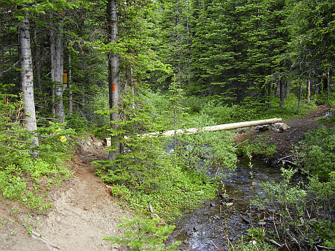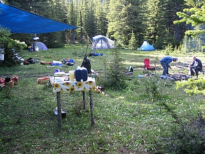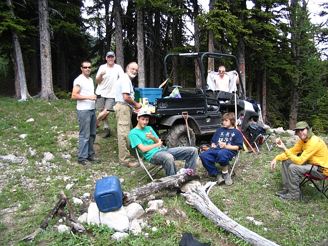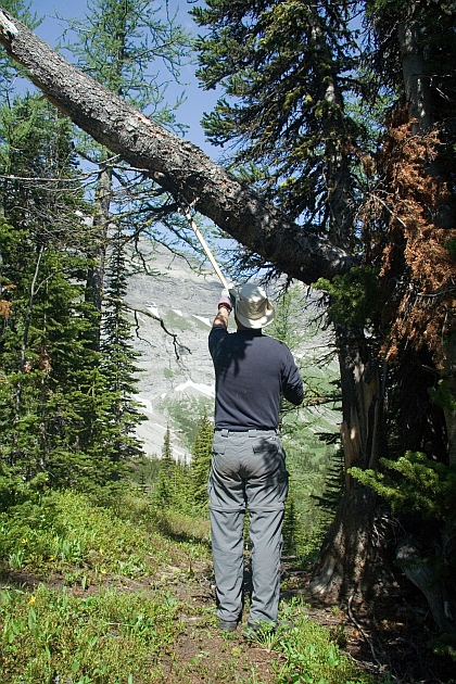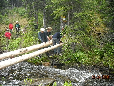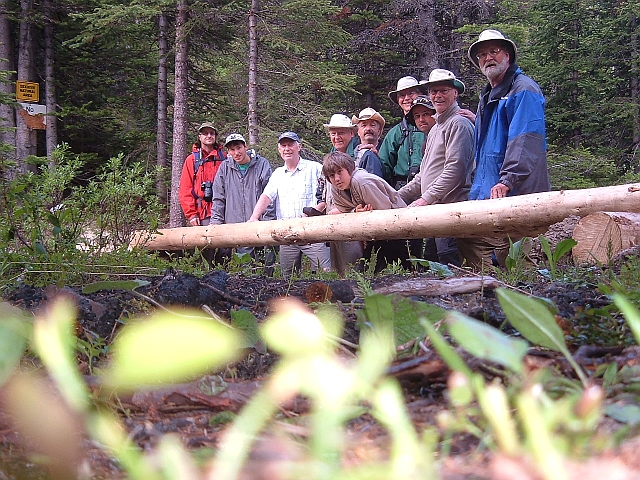 The GDT route through the upper Oldman area had seen little or no maintenance since the mid-1980s and many trail users reported losing the Trail entirely near the old Galena Mine.  During a 4-day outing, ten volunteers from Alberta and BC constructed a new log bridge over the Oldman River, and carried out tread work and brush clearing for several kilometres in each direction. New paint blazes were also applied throughout. The weather was ideal, the scenery was fantastic, the bugs few, and the camaraderie was great! Everyone went home feeling a huge sense of accomplishment.