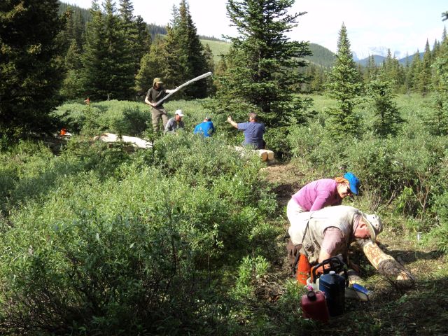 In the cut-block section, which has caused many people problems over the past years, a full day of chainsaw and Pulaski work has cleared the deadfall off the old trail in the upper block, and laid down a new path tread in the lower one. With this work, plus clearing all the way up to Lunch Stop Meadow, we hope some outfitters will start using this section of trail again, and help really establish it.