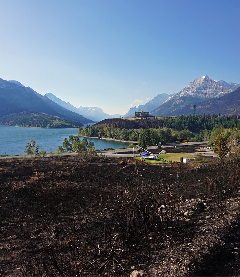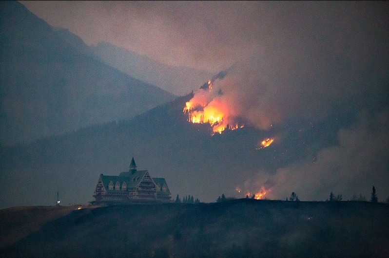 On the afternoon of September 11, the Kenow Wildfire crossed into Alberta over Akamina Pass and began demonstrating extreme fire behaviour for many hours due to high winds and critically dry vegetation. Over the next 8 hours, the wildfire would almost quadruple in size, growing to more than 35,000 hectares. Wind gusts up to 100 km/hour caused intensified burning and the fire moved very quickly northeast down the Cameron Valley along the Akamina Parkway towards the Waterton townsite. In the evening, fire became visible from the townsite and then on the north side of Crandell Mountain, soon surrounding the townsite on all sides except the lake. Firefighters worked tirelessly throughout the night to protect homes and facilities. Dedicated fire crews, high volume pumps and sprinkler systems, ensured the townsite perimeter held and the majority of infrastructure and facilities within the community were saved. Elsewhere, some buildings and infrastructure were lost to the fire.