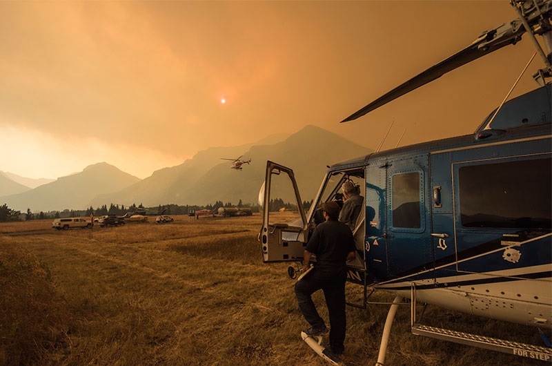 But weather conditions took a turn for the worse on September 10 when temperatures soared, humidity dropped, and high winds picked up. The Kenow Wildfire began demonstrating intense fire behaviour, burning quickly through 11.5 km of the Akamina Valley, growing to more than 10,000 hectares in size. Helicopters continued to bucket water, foam and retardant on spot fires along the Divide and crews conducted aerial ignitions in the Akamina Valley to attempt to steer the fire and reduce the potential of additional spreading. Intense fire behaviour, high winds and smoke severely reduced visibility and hampered fire suppression activities.