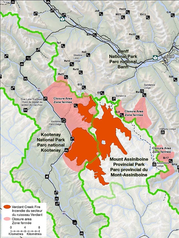 The Verdant Creek Wildfire was started by lightning strikes in the Verdant Creek valley on July 13 or 14, and burned 15,500 hectares of wilderness in Kootenay National Park and Mount Assiniboine Provincial Park. 69 kilometres of the GDT from Wonder Pass to Hawk Creek trailhead were closed in August and September, and the GDT remains closed in Banff National Park from Citadel Pass to Sunshine Meadows. None of the GDT was actually burned by the Verdant Creek Wildfire.